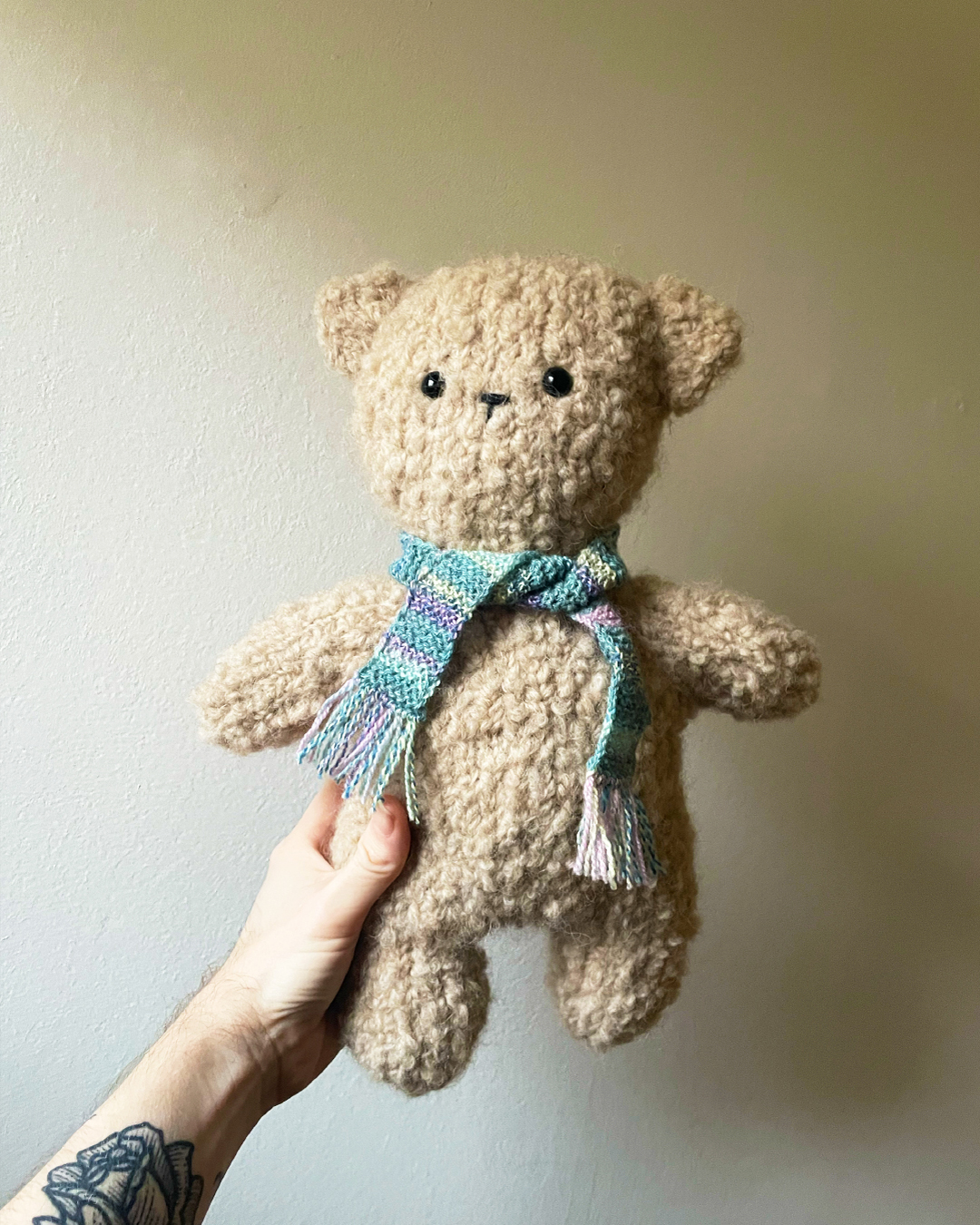 It is worked from the head down and in the round. I used the magic loop technique which is my preferred method for doing small circumferences. There are a couple of skills needed like basic increases and decreases and also the edges are finished with grafting. I would say to take your time with the grafting as it’s tricky to see the stitches with such a textured yarn. That being said the textured yarn is very forgiving. As it is knit quite tightly I did notice a couple of times that I put my needle through a bouclé loop rather than the stitch so keep an eye on that. I found a crochet hook quite helpful when that happened so I could rearrange the stitches a bit easier. I would also say that it is near impossible to count rows from looking at the fabric so a row counter is super helpful, especially if you want to get his arms and legs the same length.