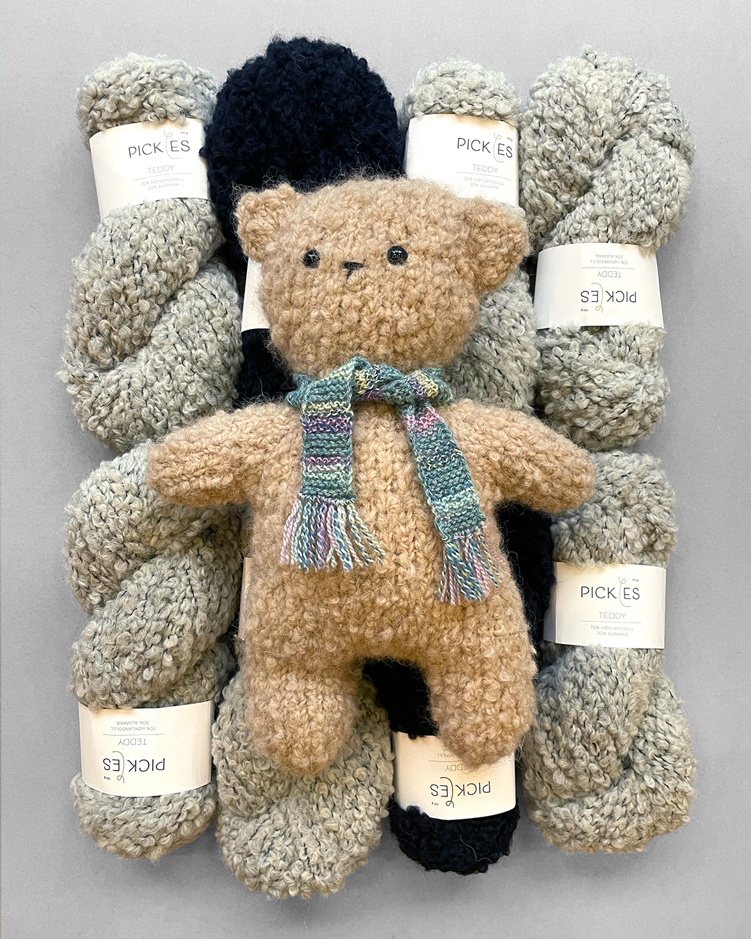 Pickles Teddy is an all natural bouclé yarn created from a combination of a bouncy alpaca spun around a sturdy Highland wool core. It is a squishy chunky weight yarn that comes in a range of neutral shades. Depending on the fabric you want you can knit it on anything from a 7mm up to a 12mm to create a dense warm jumper or a light floaty accessory. It’s super soft so it’s great for accessories you wear next to the skin like hats and scarves and knit at a tighter gauge gives you an almost sheep skin like look.