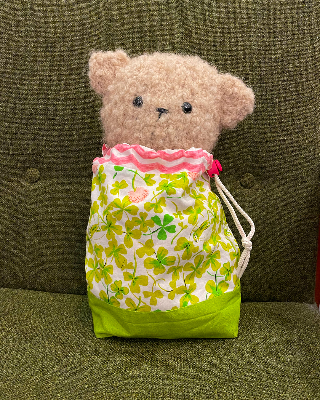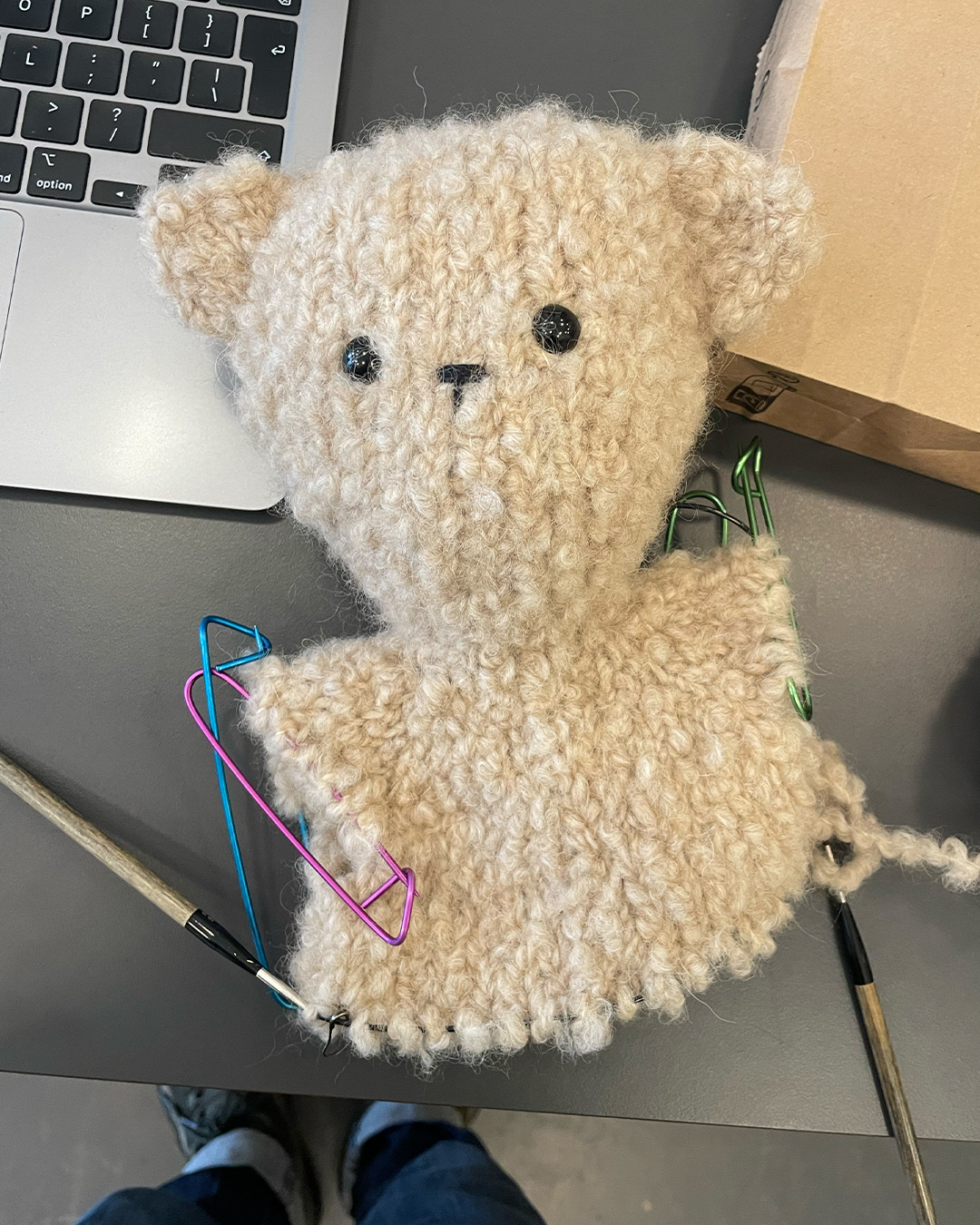 It is worked from the head down and in the round. I used the magic loop technique which is my preferred method for doing small circumferences. There are a couple of skills needed like basic increases and decreases and also the edges are finished with grafting. I would say to take your time with the grafting as it’s tricky to see the stitches with such a textured yarn. That being said the textured yarn is very forgiving. As it is knit quite tightly I did notice a couple of times that I put my needle through a bouclé loop rather than the stitch so keep an eye on that. I found a crochet hook quite helpful when that happened so I could rearrange the stitches a bit easier. I would also say that it is near impossible to count rows from looking at the fabric so a row counter is super helpful, especially if you want to get his arms and legs the same length.