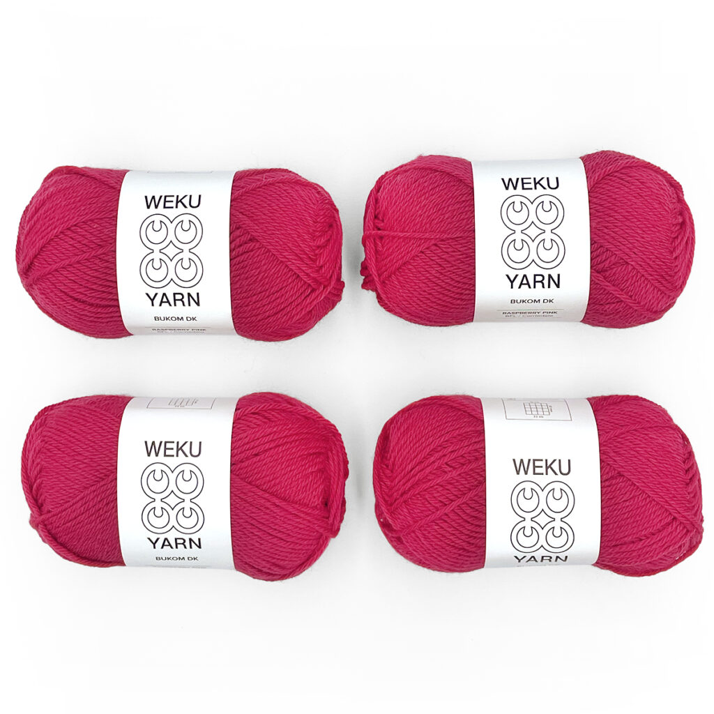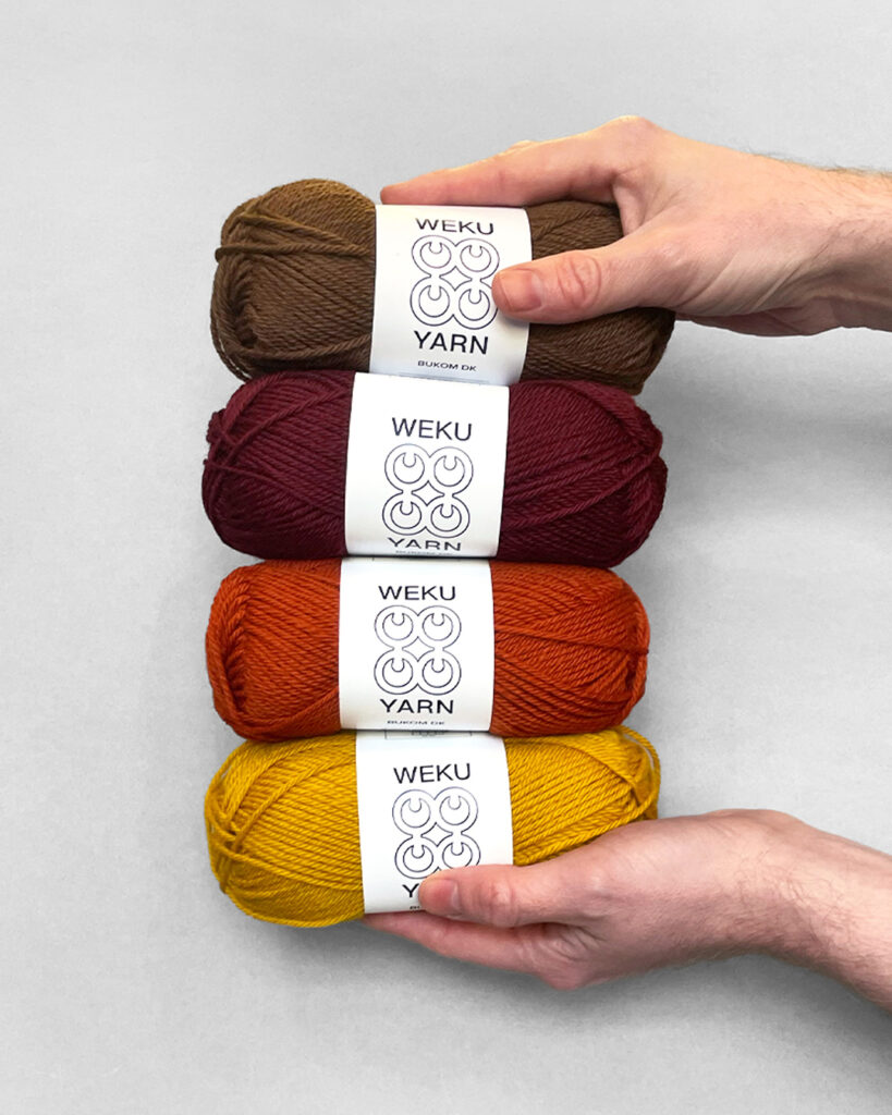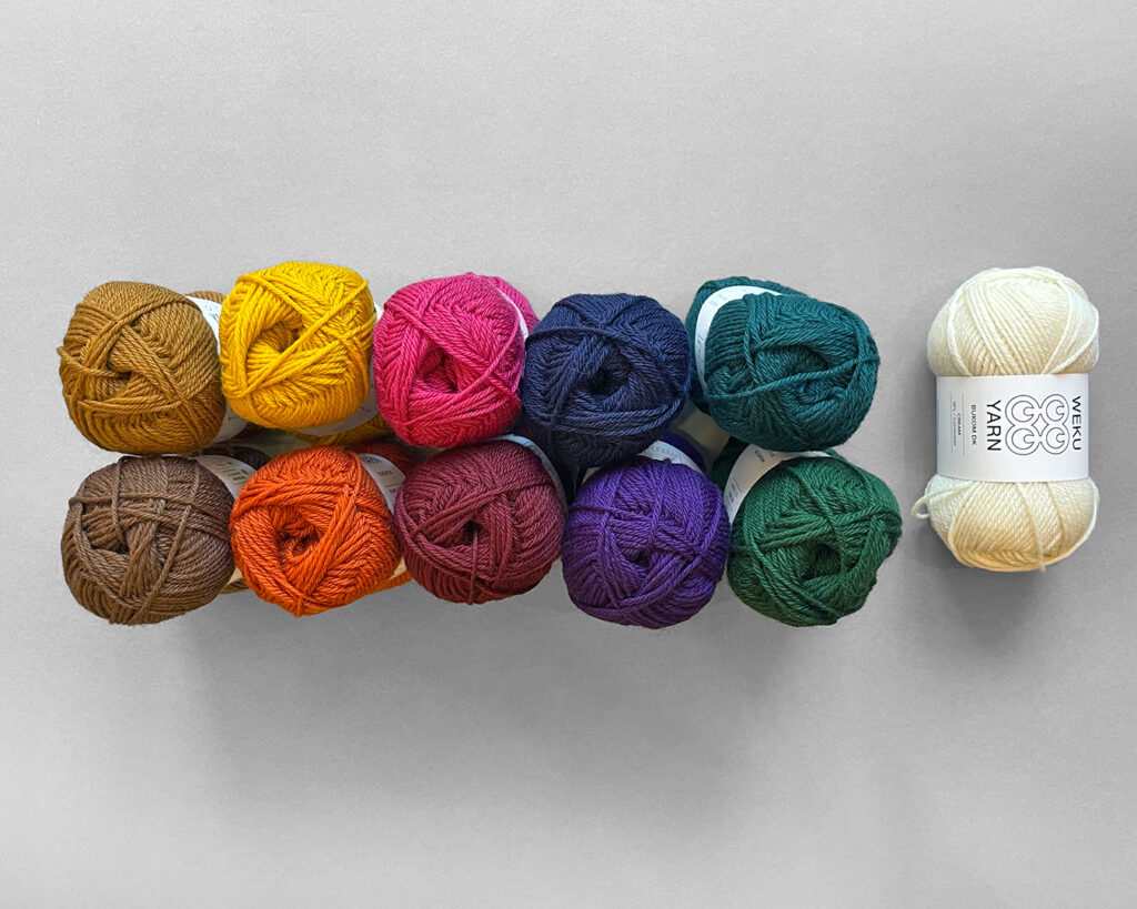 Bukom DK was developed with a mill in Yorkshire spinning a 50/50 blend of Bluefaced Leicester (BFL) and Corriedale. Spun to a smoothly twisted classic DK weight. The yarn is durable and soft but retains a slightly toothy wool quality. BFL is one of the softest of the British breed sheep and adds a sheen and drape to the yarn. Corriedale is a cross between Merino and Lincoln Longwool so has the softness but also adds a plump bounciness to the blend that will bloom with blocking. There are eleven colours in the range combining rich dark and bright shades. The colour range was developed by Hannah who hand dyed a palette before sending it off to production. This makes the colour range feel very in tune with what makes Weku Yarn unique.